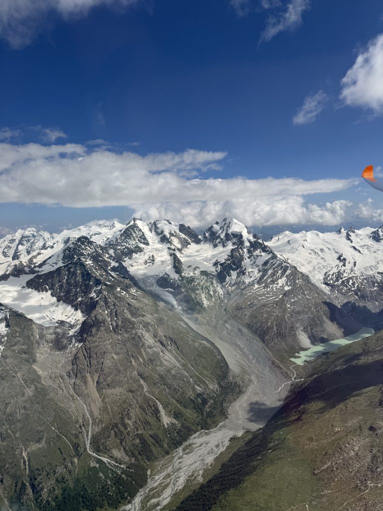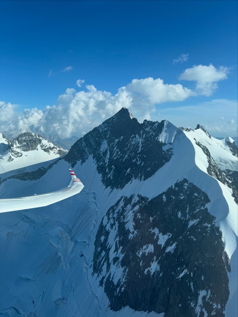 Mein Ziel für die zweite Woche war es, auch mit dem 7C über den Piz Bernina zu fliegen. Die Bedingungen waren weiterhin exzellent, so dass ich wie in der ersten Woche, gleich mit dem ersten Flug alle Flugphasen 1:1 wiederholen konnte.Das Erlebnis war heftig, so dass es mir einige Male kalt den Rücken runtergelaufen ist: