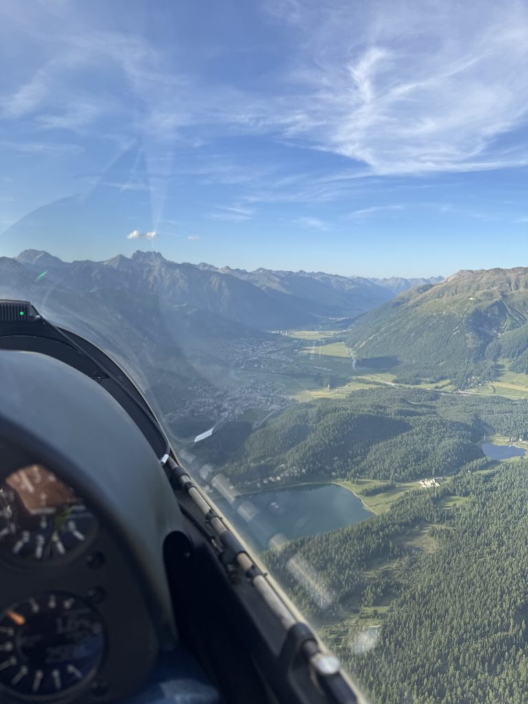 Zuerst der Windenstart mit mässiger Ausklinkhöhe, dann sofort an den Muottas den Hang in engen Achter-Schlaufen polieren, um damit langsam an Höhe zu gewinnen. Nach gefühlt Hunderten von «Speed»- und «Banks»-Calls von meinem Cumulus-Fluglehrer Rolf König, haben wir die Bergstation Muottas Muragl unter uns gelassen.